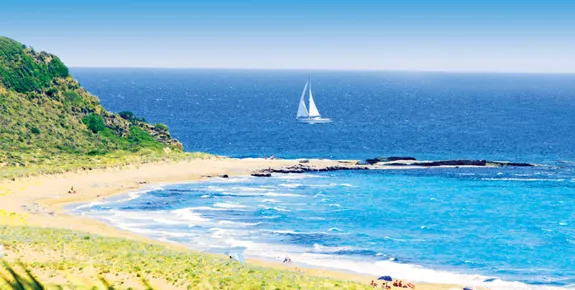The beach is actually two small coves, with a handy beach-side cafe and exceptionally clear water.