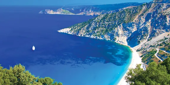 It’s 22km from Fiskardo and a spectacular 30-minute drive along the coast that ends with stunning views down to the beach itself.