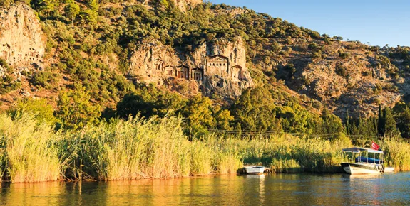 The Lycian rock tombs, elaborate sculptures carved into the mountainside, commemorate the last, doomed kings, and provide an awe-inspiring backdrop to a trip down the river; particularly at sunset, when the rocks glow a warm rose-gold, and when lit up after nightfall. Behind these imposing relics lie the ruins of the ancient city, inviting you to explore a well-preserved amphitheatre, Roman baths and a Byzantine basilica.