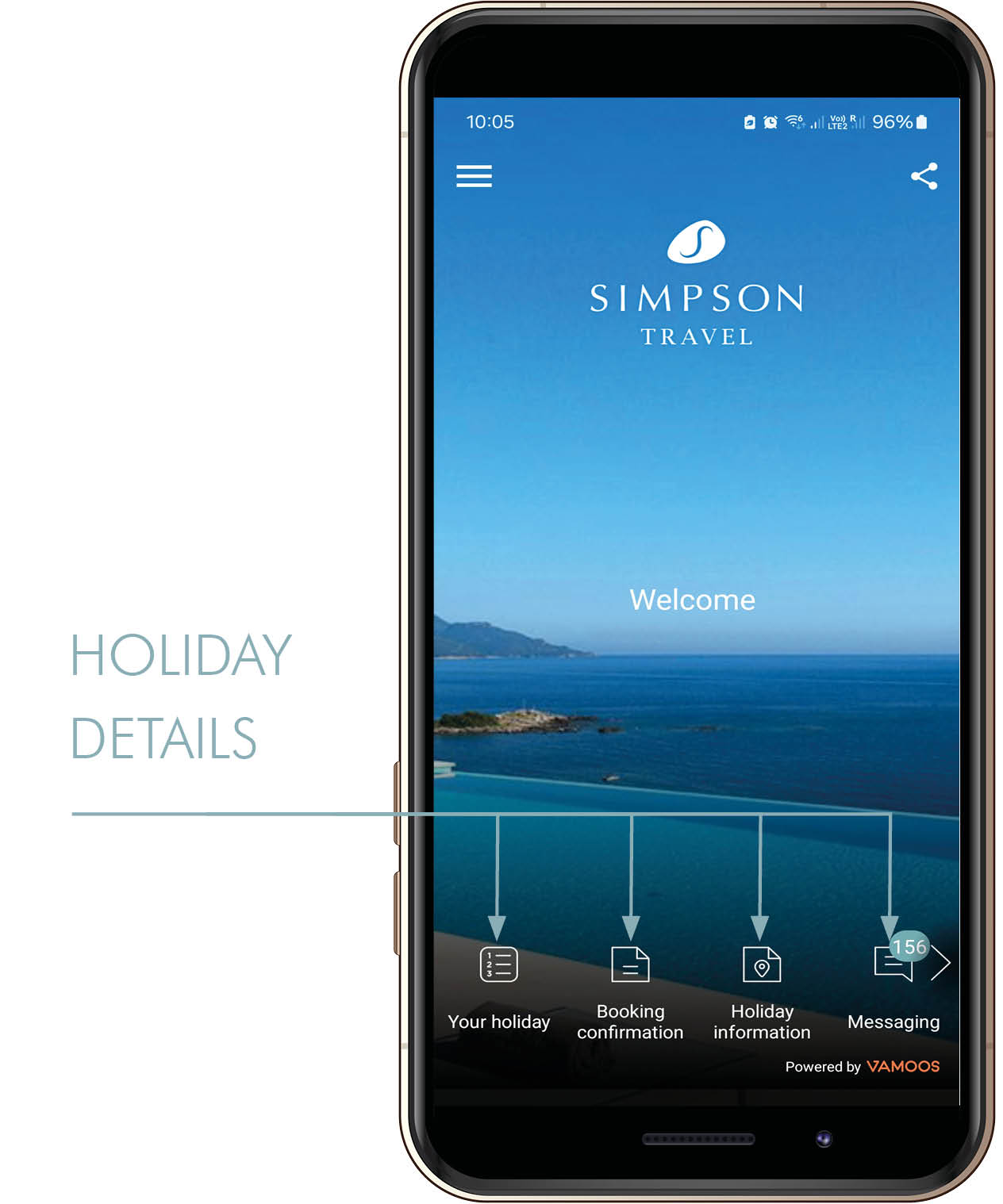 We are delighted to introduce the Simpson Travel app, bringing all your essential holiday information directly to your mobile device. It’s the simplest way to keep your travel details in the palm of your hand, including driving directions, local information, contact numbers for our concierge teams overseas and more.