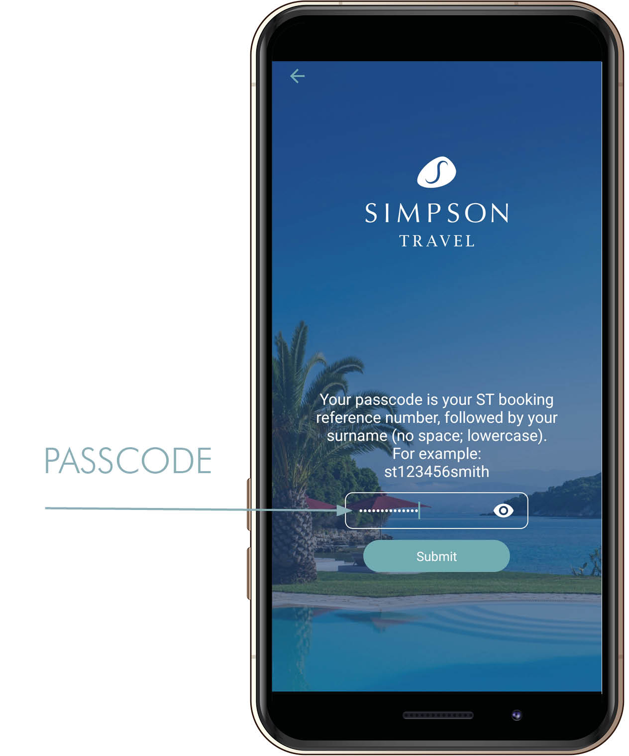 1) Your passcode is your Simpson Travel booking reference, followed by your surname (no space, lower case) e.g. ST123456smith, then hit submit.