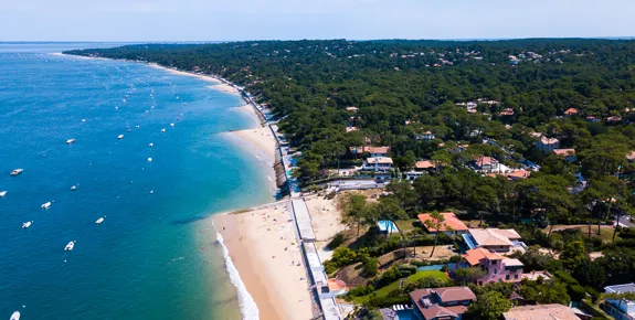 About a five-minute drive from Arcachon centre, the beach stretches from the town to the jetty at Le Moulleau.