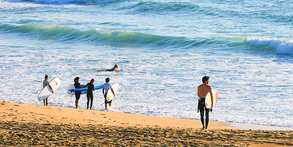 A wide boulevard of restaurants, bars, shops and surf schools usher you towards the dunes of this more touristy but well-equipped beach, with a distinctly youthful vibe.