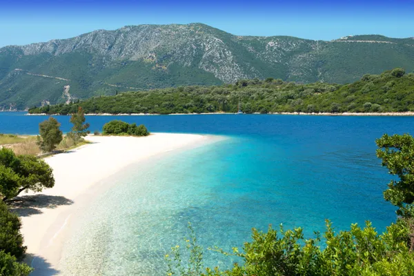 On a spit of land protruding into the Meganissi Channel, opposite Thilia Island, Stravnam is a gently sloping beach with small stones and great views: see the sun set behind Lefkada.