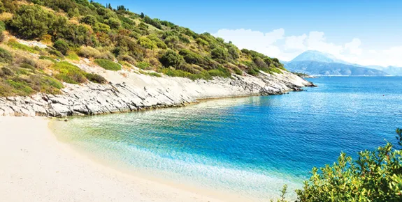 On a spit of land protruding into the Meganissi Channel, opposite Thilia Island, Stravnam is a gently sloping beach with small stones and great views: see the sun set behind Lefkada.