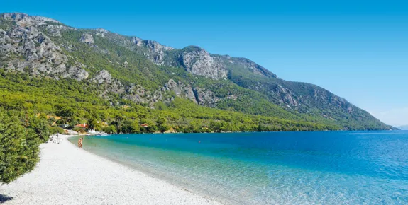 The backdrop of forest-covered mountains more than makes up for the fact that it’s pebbles, not sand. Hire a comfortable sunbed and parasol or sip a drink in the simple rustic restaurant.