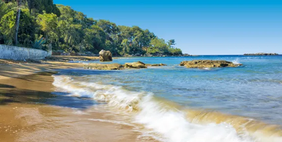 A 2km stretch of small sandy bays, with rockier parts to explore too. There are a few picnic tables, changing rooms and a small snack bar. Enjoy the natural shade of pines or a hired parasol.