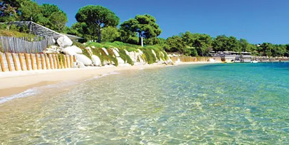 Plenty of natural shade from the pine trees, fine sands and shallow waters make this ideal for young children. Sunbeds and parasols can be rented from the on-sand restaurants.