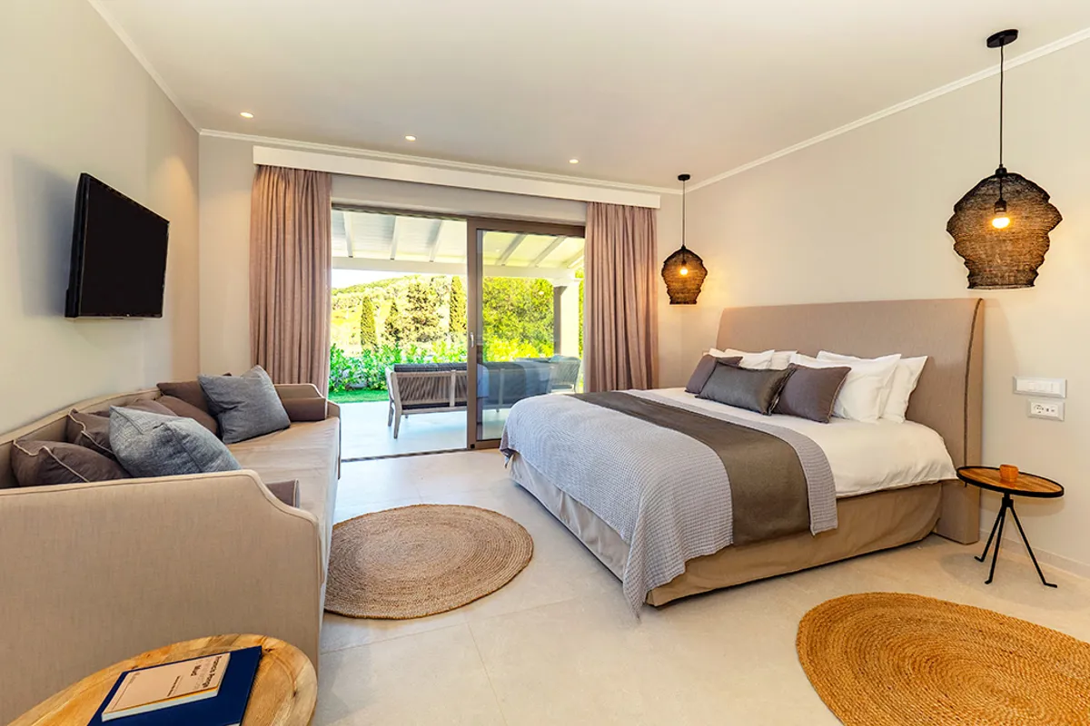 Set back above the hotel, this luxury accommodation is designed for couples and families seeking a more indulgent holiday, with exclusive use of a shared pool and honesty bar as well as private terraces and balconies with captivating views across Avlaki Bay.