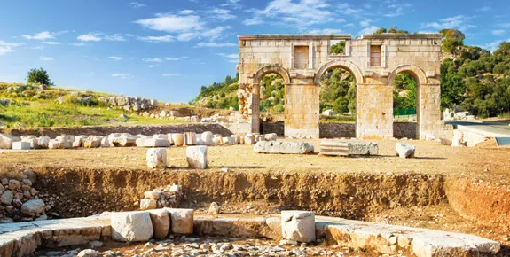 The ruins of Patara, 15 minutes from Kalkan, are one of the most important archaeological sites in the eastern Mediterranean. The city, said to be founded by Patarus, son of Apollo, is slowly being rediscovered, with finds so far including a theatre, chapel and the triple arch of the city’s gates.