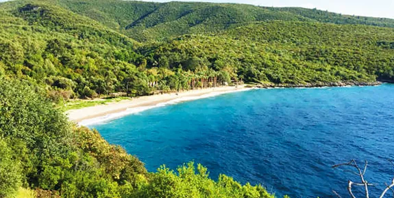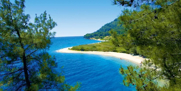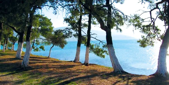 Calm waters and a backdrop of olive tree and pine-covered mountains are reason enough to visit this narrow sandy beach. There are sunbeds and parasols for hire, showers and restaurants and snack bars.