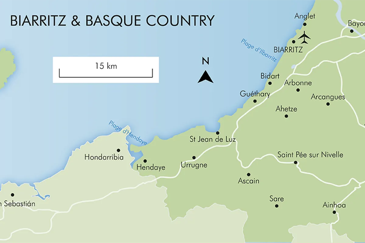 There’s a perfect, picture book simplicity about Bidart – the white parasols in the square, the oxblood-red, painted timbers of the houses and the vivid green of the plane trees and surrounding hills. Walk down towards the sea and there’s also an intriguing war memorial overlooking the coast. For golfers, the nine-hole Golf d'Ilbarritz is a short drive away and, in July and August, Saturday morning and Thursday evening markets pop up to bring a little extra colour to this pristine Basque village.