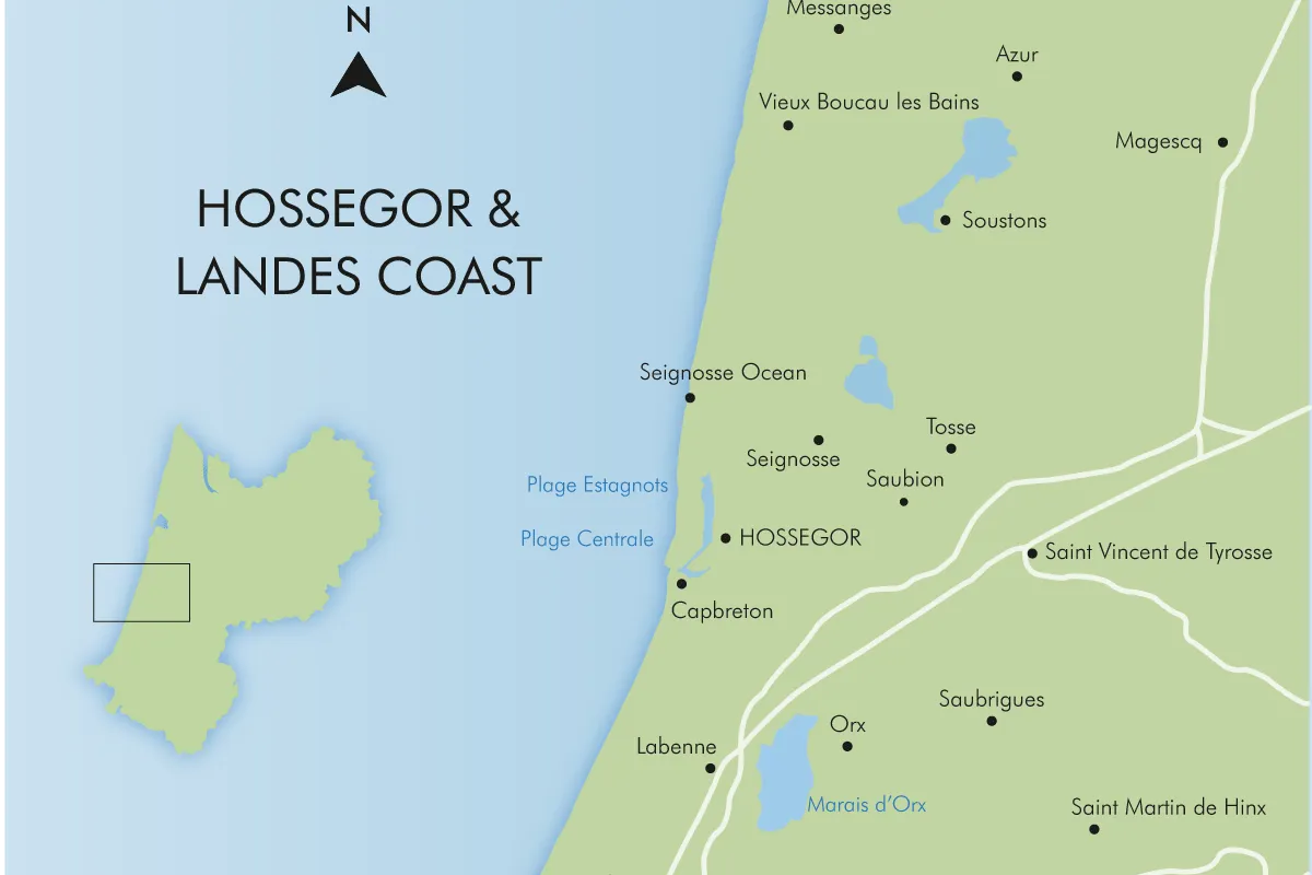 Just 15 minutes' walk from the heart of Hossegor, take the main bridge over the lake and turn right at the Hotel Mercedes; it's another ten minutes on foot.