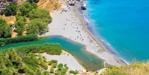 South of Rethymno, one of the most famous beaches on Crete sits at the mouth of a river and lagoon, backed onto by a lush palm forest.