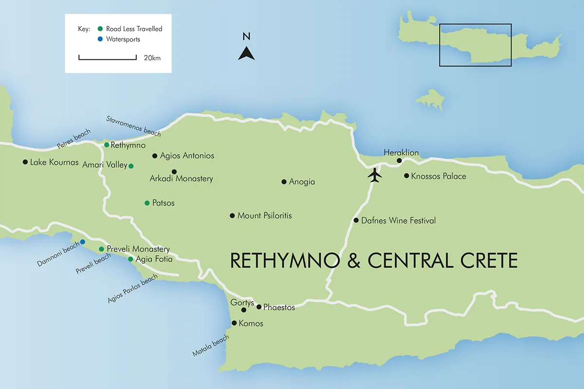 As the birthplace of Zeus, Central Crete carries a certain historic and spiritual gravitas. Knossos, the Minoan Bronze Age palace, steals the show, but there are many other smaller archaeological sites, churches and towns to cast you back in time. However, with harbourside dining, beautiful beaches, mountain villages and vibrant summer festivals, the here and now also has a lot to offer. And Rethymno, which has clung on to much of its authentic beauty and charm, is a welcome addition to your island experience.