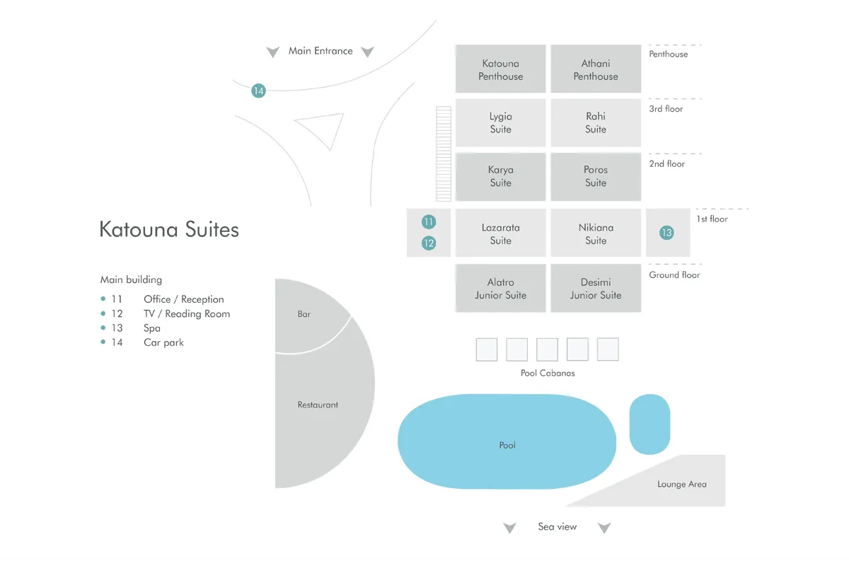 - Top floor – Katouna and Athani Penthouse suites 47m², each with front balcony at least 12m²