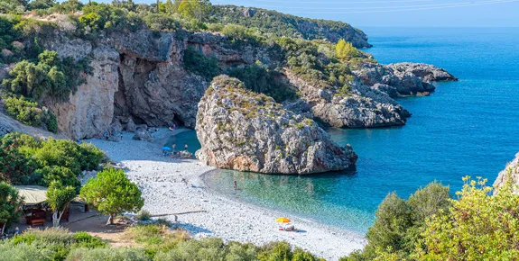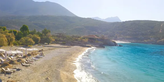 This is Kardamyli’s beach, and combines perfectly with a visit to the town. Comprised of small pebbles lapped by crystal clear water, there are sun beds, a café and a handy boardwalk to help you navigate the pebbles.