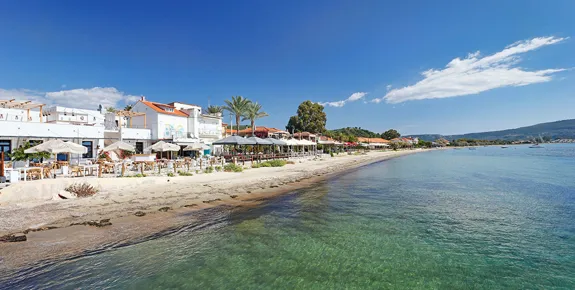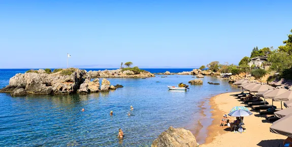 Walk around the headland from Stoupa and you reach Kalogria, famous for its fine sand and turquoise water. Deeper than Stoupa but not as long, it’s very well serviced with a lifeguard, beach bar and volleyball court.