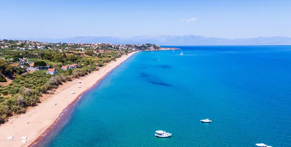 Close to Koroni on the Messinian gulf, another very long sandy beach that offers both developed and undeveloped sections. Combine with a visit to Koroni castle or perhaps dinner by the harbour.
