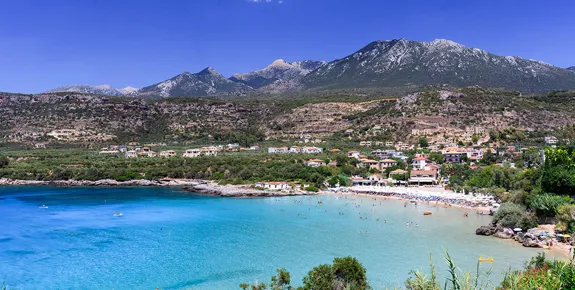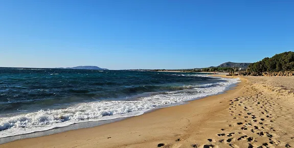 A sandy, family-friendly choice just outside Gialova village, where you’ll find excellent restaurants and all the facilities you need. The beach shelves gently and feels nicely sheltered in the calm waters of Navarino bay.