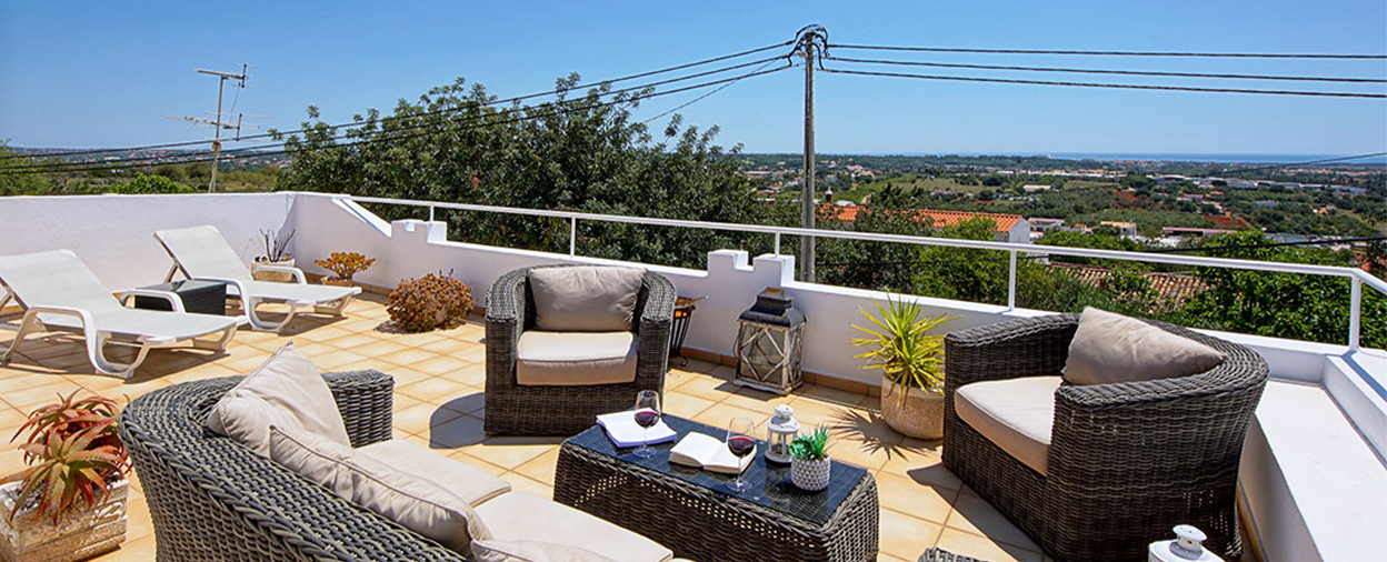 Our favourite spot at Casa das Flores has to be the large, south-facing roof terrace, equipped with outdoor sofas so you can sit and enjoy a drink along with the sweeping views across the countryside to the sea.